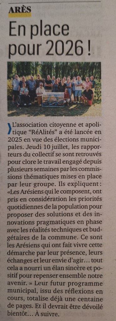 Ils expliquent » Les Arésiens qui le composent, ont pris en considérations les priorités quotidiennes de la population pour proposer des solutions et des innovations pragmatiques en phase avec les réalités techniques et budgétaires de la commune. Ce sont les Arésiens qui ont fait vivre cette démarche par leur présence, leurs échanges et leur envie d’agir… tout cela a nourri un élan sincère et positif pour repenser ensemble notre avenir. «